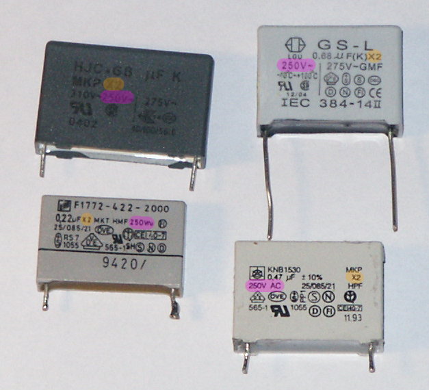 An C1 werden besondere Anforderungen gestellt. Falls dieser Kondensator kurzschließen würde, würde sich so ziemlich alles im Gehäuse in Rauch auflösen. Die Brandgefahr wäre groß. Daher wird für C1 ein sogenannter X-Kondensator (in diesem Fall X2) verwendet, der besondere Eigenschaften besitzt. Zum Einen ist er, obwohl 250V∼ drauf steht, für Hochspannungsimpulse, wie sie im Netz hin und wieder vorkommen gerüstet. Zum Anderen schließt er auch bei einem Durchschlag nicht kurz, sondern ist "selbstheilend". Das bedeutet, daß er zwar bei einem Durchschlag an Kapazität verliert, aber daß es nicht zu einem dauerhaften Kurzschluß kommt, der den Rest der Schaltung zerstören würde. X-Kondensatoren erkennt man am Aufdruck X2 (im Bild gelb markiert), der Spannungsangabe (pink markiert) und den unzähligen Prüfzeichen der verschiedenen Zulassungsstellen der einzelnen Länder.