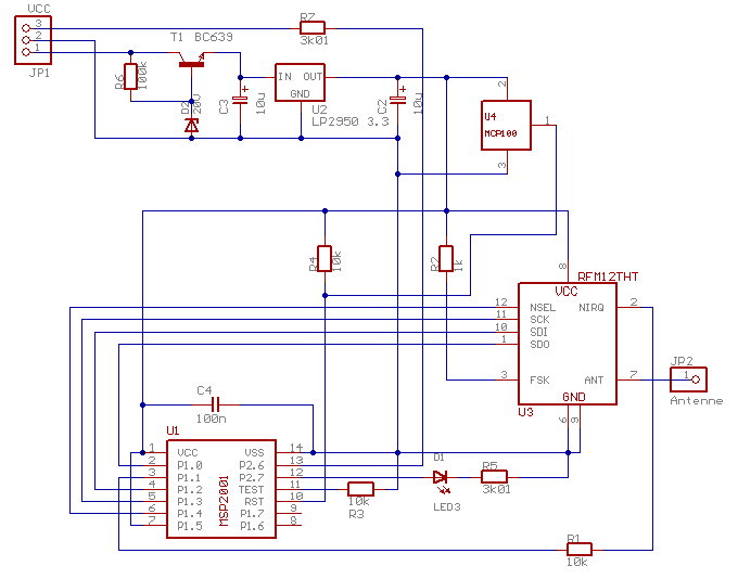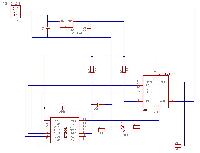 Während ich diese Zeilen schreibe, frage ich mich nach dem Zweck des 51k Widerstands R1. Das Signal NIRQ vom RFM12 ist ein Ausgang und könnte eigentlich direkt an den MSP angeschlossen werden. Der Grund ist folgender: Ich habe die Schaltung zunächst auf einem Steckbrett mit anderer Pinbelegung aufgebaut. Da war NIRQ an P1.5 oder P1.4 angeschlossen. Beide Pins werden für die InCircuit-Programmierung des MSPs gebraucht. Wenn da noch ein Ausgang vom RFM12 dran hängt, kann das Programmiertool nicht arbeiten. Der Widerstand ermöglicht es, das Programmieren durchzuführen, ohne dafür die Schaltung ändern zu müssen. In der hier dargestellten Schaltung ist R1 also unnötig, er wurde bei der Neubelegung der Pins schlicht vergessen wegzulassen.