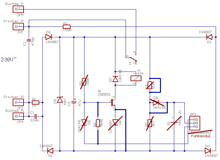 Der Strom fließt von Stecker P über R2, D2, D5, D1 und C1 nach Stecker N für den Fall, daß an Stecker P positives Potential herrscht. Ist Stecker P negativ, fließt der Strom über R2, D3, D5, D4 und C1. Die vier Dioden D1-D4 bilden einen Brückengleichrichter. Da der Kondensator bei der Netzfrequenz 50Hz einen Blindwiderstand von ca. 9,6kΩ hat, ist der fließende Strom begrenzt. An der Zenerdiode D5 baut sich eine Spannung von etwa 50V auf. Durch den Kondensator C3 wird die Spannung geglättet.
