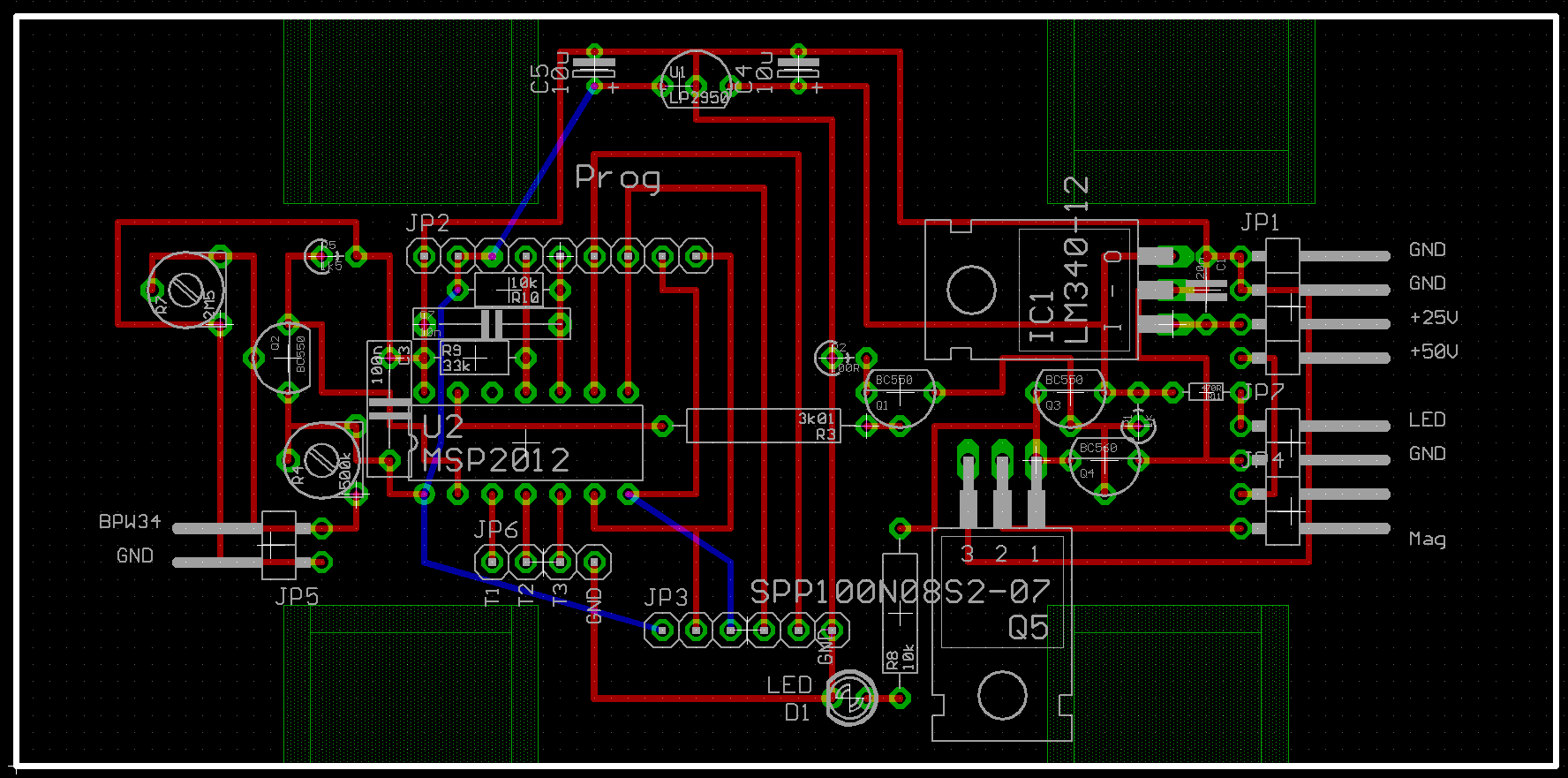 Die vier grün schraffierten Bereiche müssen auf der Unterseite freigehalten werden. Da ist die Leiterplatte an den vier Alustangen, die am Magneten befestigt sind, festgeschraubt.