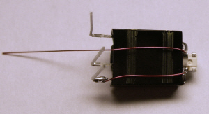 Neben den schon erwähnten Tasten für die Bedienung ist im Griffstück Platz für 3 AAA-Batterien vorgesehen. Darüber befindet sich die Elektronik, die im Wesentlichen aus dem Mikrocontroller und einer Stromquelle besteht. Da beim Schuß ein sehr großer Pulsstrom durch die Sende-LED fließt, muß ein realtiv großer Kondensator verwendet werden. Dieser ist wegen seiner Baugröße nicht auf der Leiterplatte, sondern in der Nähe des Laufs angebracht. Die Sendediode steckt im Lauf und da, wo sich bei einer echten Pistole der Hahn befindet, gibt es noch eine Indikator-LED, die verschiedene Betriebszustände anzeigen kann und die auch bei jedem Schuß kurz aufleuchtet.