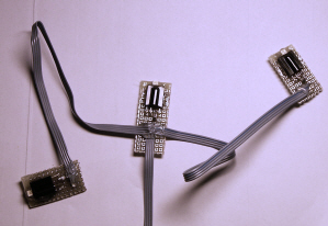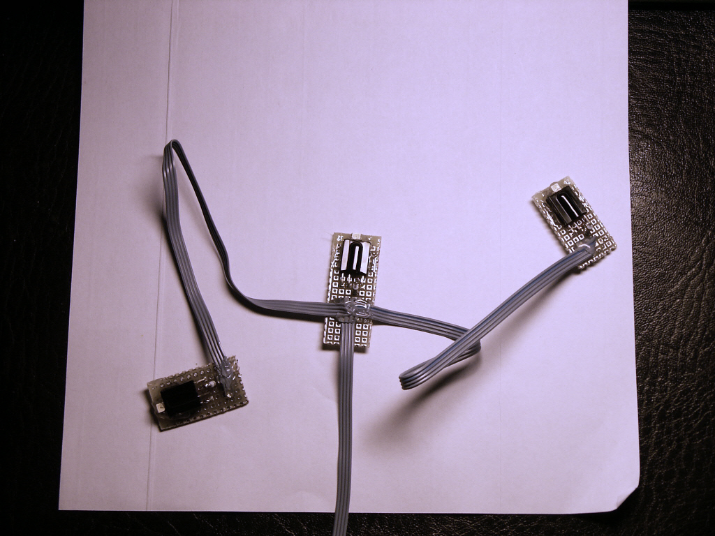 Drei Empfängereinheiten werden mit vierpoligem Flachbandkabel parallelgeschaltet und im Winkel von ca. 120° zueinander auf die Mütze genäht.