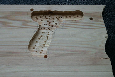 Ich habe mit einem Forstner-Bohrer eine Menge Löcher in das 18mm-Brett gebohrt. Die Löcher sind ungefähr 12mm tief. Die Bohrungen wurden ins Rohmaterial gesetzt und erst danach wurde die korrekte äußere Form ausgesägt. Dadurch war es viel einfacher das Holz festzuhalten. Im Bild sind noch drei zusätzliche Löcher mit 8mm Durchmesser zu sehen. Über diese werden die beiden Holzhälften mit gekürzten Holzdübeln miteinander verbunden. Entsprechend wurde mit dem dünneren Holz verfahren, nur daß hier natürlich nur ca. 4mm tief gebohrt wurde.