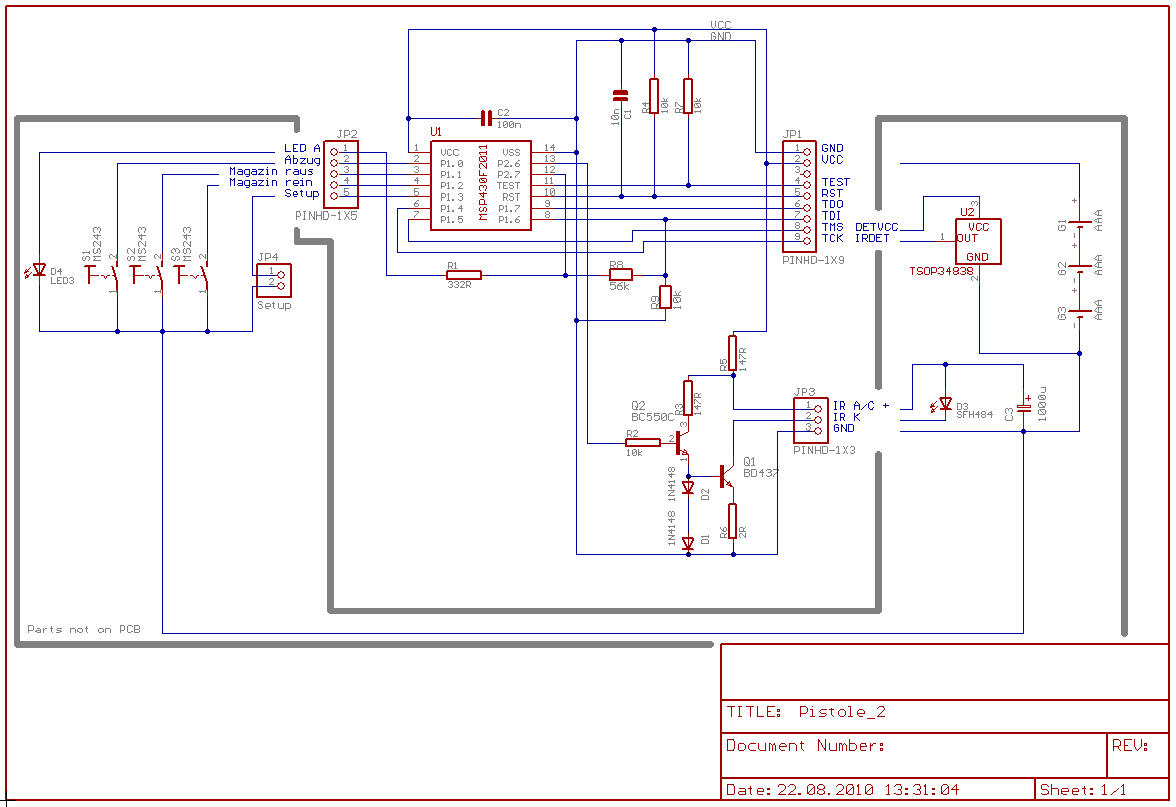 Der Schaltplan ist sowohl im PDF-Format als auch als JPEG-Datei abgespeichert. Der graue Rahmen trennt die Bauteile, die auf der Leiterplatte eingelötet sind, von denen, die im Pistolengehäuse verteilt sind.