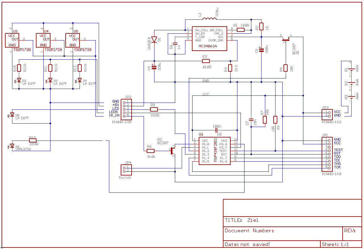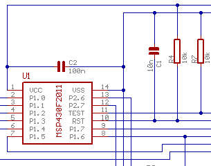 Wie schon bei den Pistolen ist auch das Ziel mit einem MSP430F2011 aufgebaut. Der Programmierstecker ist genau so beschaltet wie bei den Pistolen. Auch der Abblockkondensator und die Resetbeschaltung ist identisch.
