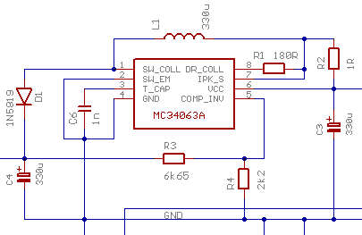 Wie schon erwähnt müssen für die Infrarotdetektoren 5V erzeugt werden. Das geschieht mit dem Schaltregler MC34063A. Dieses