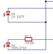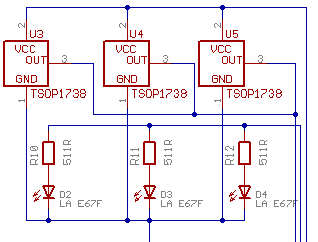 Direkt bei den Detektoren sind jeweils leuchtstarke LEDs D2, D3 und D4 angebracht. Sie signalisieren durch Blinken einen eventuellen Treffer. Jede hat ihren eigenen Vorwiderstand. Die LEDs werden direkt von einem Ausgangspin des Prozessors gespeist. Wegen der gewünschten breiten Abstrahlcharacteristik sind die Typen LA E67F von Osram verwendet, deren SMD-Gehäuse hier eher hinderlich ist.