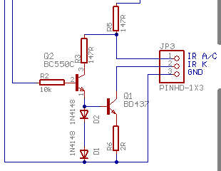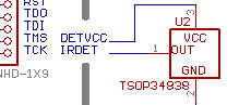 Wie schon erwähnt, standen mir zu Beginn keine IR-Detektoren für 3V Betriebsspannung zur Verfügung. Ich habe die Schaltung im Nachhinein nicht geändert, da sie ja problemlos funktioniert. Sollte es aber nötig sein weitere Mützen zu bauen, so würde ich den ganzen Kram um den MC34063A weglassen und die IR_Empfänger direkt an den Mikrocontroller anschließen. Auch der Transistor Q1 kann dann natürlich entfallen, genauso Q2. Die Software müßte die andere Polarität zum Einschalten der Versorgung der Detektoren berücksichtigen (Q1 ist eingeschaltet, wenn der Prozessor eine 0 ausgibt).