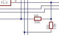 Jedesmal, wenn die LED D4 eingeschaltet wird, kann an Pin P1.6 über den Spannungsteiler R8, R9 die Betriebsspannung