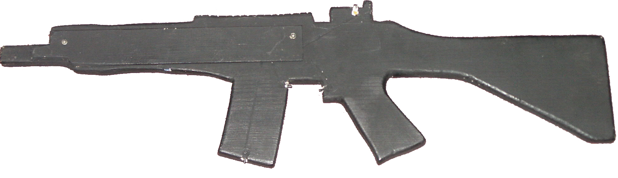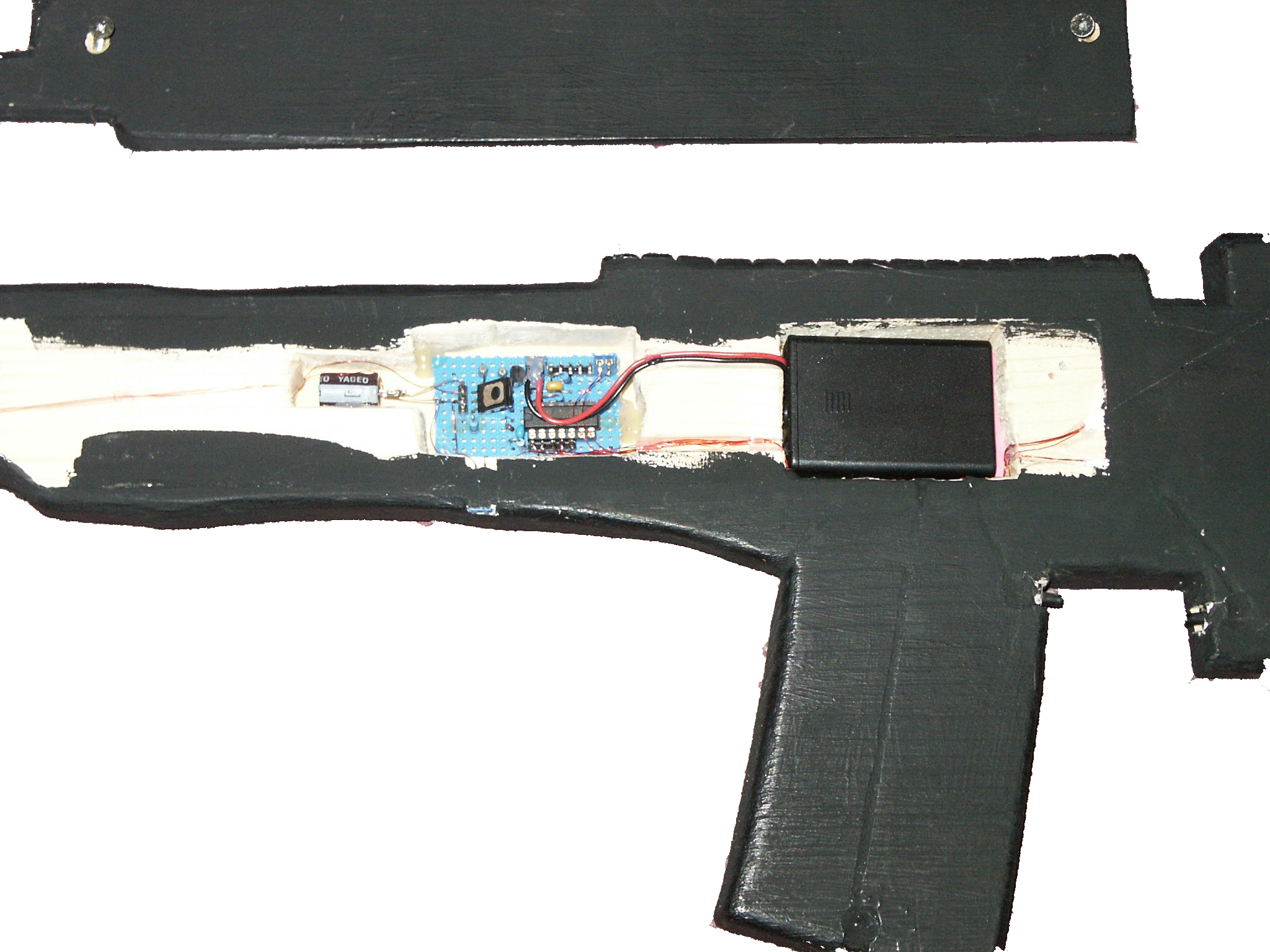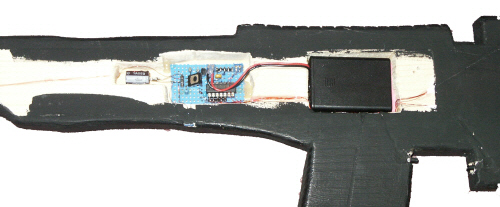 Es blieb nicht bei den Pistolen. Man sieht damit angeblich nicht cool genug aus. Daher gibt es neuerdings auch Gewehre, die aus derselben Elektronik aufgebaut sind. Da im Gewehr mehr Platz ist, kann ein besserer Batteriehalter verwendet werden.