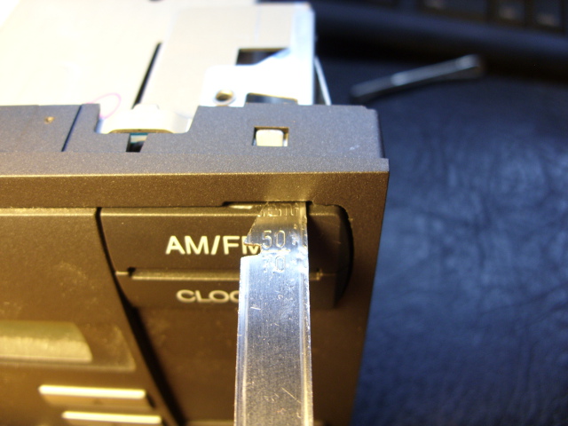 Wenn man weiß wie es geht, ist es ganz einfach. Nach dem Ausbau war mir dann erst klar, warum man was wie machen muß, um das Radio zu entriegeln. Es ist nun auch klar, daß die Form der Blechstreifen keine besondere Rolle spielt, sondern daß sie eher spitzer gestaltet sein können, um das Einschieben zu erleichtern. Auch die Tiefe der Kerbe ist nicht wirklich wichtig, es muß nur das Federblech hineinpassen. Eine Breite von 1,5mm reicht vollkommen aus, sie kann aber problemlos auch breiter sein. Im Handel gibt es Streifen, die noch irgend welche Schlitze oder Löcher haben. Zumindest für dieses Autoradio waren diese nicht nötig.