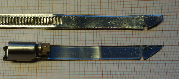 In der Zeichnung ist der Streifen 10mm breit und endet vorne in einer abgerundeten Spitze. Am anderen Ende ist eine große Öse um den Finger durchstecken zu können. Bei meiner Suche nach einem geeigneten Blech fiel mein Blick auf zwei große Schlauchschellen. Die Bleche haben eine Breite ca. 9mm Breite. Das ist also ungefähr 10mm, das musste reichen!