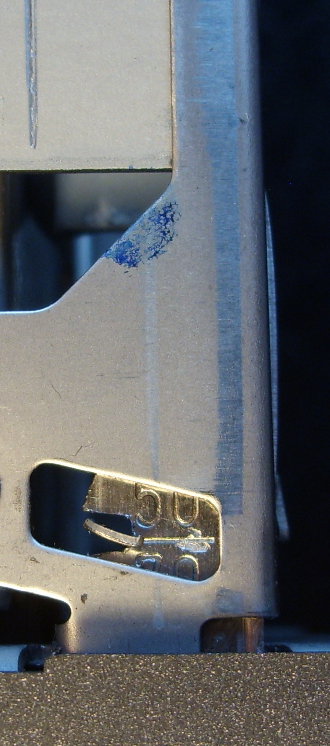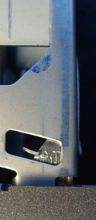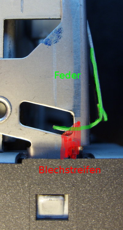 Die Bilderserie zeigt, wie der Blechstreifen zunächst die Feder berührt und sie dann im weiteren Verlauf nach links drückt. Am Ende ist dann die Feder in der Kerbe eingerastet. Der Streifen sollte möglicht waagerecht eingeführt werden.